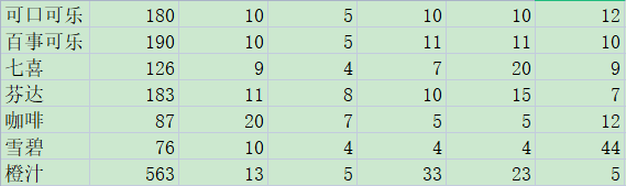 現(xiàn)有7種飲品,可口可樂,百事可樂,七喜,芬達(dá),咖啡,雪碧,橙汁。測(cè)試人員對(duì)其營(yíng)養(yǎng)成分進(jìn)行觀測(cè)值聚類分析。
